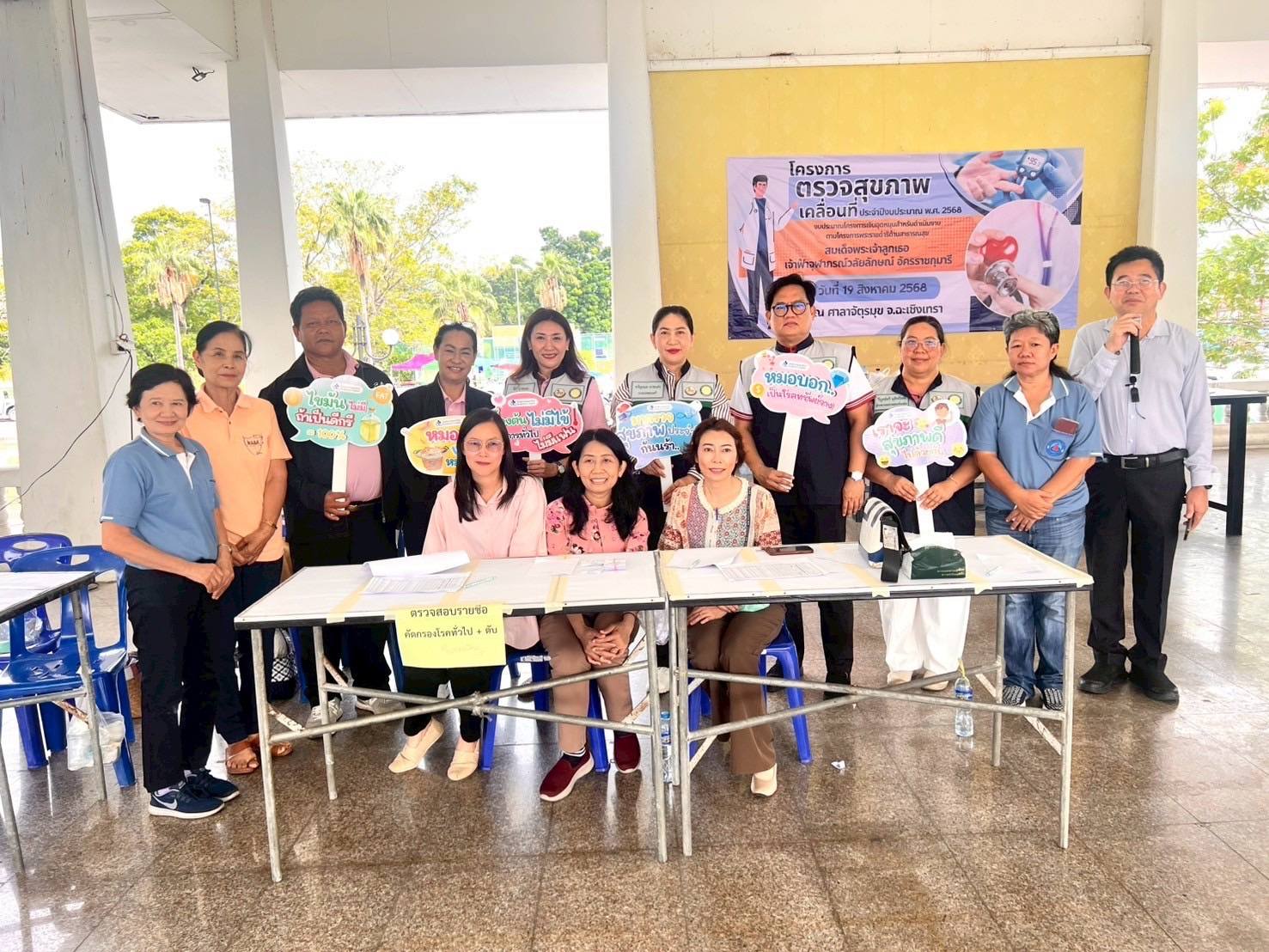 วันที่ 19 สิงหาคม 2568 ณ บริเวณศาลาจัตุรมุข หน้าศาลากลางจังหวัดฉะเชิงเทรา #นางขวัญกมล ฉายแสง นายกเทศมนตรีเมืองฉะเชิงเทรา #นายวิโรจน์ ราชวงษ์ รองนายกเทศมนตรี #นางสาววียา ฉายแสง เลขานุการนายกเทศมนตรี ลงพื้นที่ตรวจเยี่ยมโครงการตรวจสุขภาพเคลื่อนที่ ตามพระราชดำริของสมเด็จพระเจ้าลูกเธอ เจ้าฟ้าจุฬาภรณ์วลัยลักษณ์ อัครราชกุมารี โดยเน้นการตรวจสุขภาพเชิงรุก ให้แก่ประชาชนในเขตเทศบาลเมืองฉะเชิงเทรา ที่มีอายุ 35 ปี ขึ้นไป