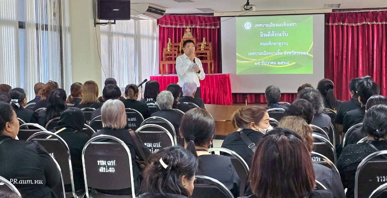 วันที่ 15 ธันวาคม 2568 เวลา 15.00 น.นางขวัญกมล ฉายแสง นายกเทศมนตรีเมืองฉะเชิงเทรา มอบนายวิโรจน์ ราชวงษ์ รองนายกเทศมนตรี สมาชิกสภาเทศบาล หัวหน้าส่วนราชการ ร่วมให้การต้อนรับ อาสาสมัครท้องถิ่นรักษ์โลก (อถล.) เทศบาลตำบลบางริ้น จังหวัดระนอง จำนวน 200 คน เข้าศึกษาดูงานด้านการคัดแยกขยะครัวเรือน การจัดโครงการธนาคารขยะรีไซเคิล ของเทศบาลเมืองฉะเชิงเทรา เพื่อนำความรู้ไปพัฒนาศักยภาพของ อถล. ทม.บางริ้น ให้มีประสิทธิภาพมากขึ้น