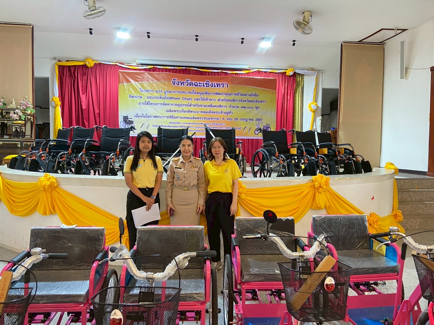 นางจำเนียร สุขสมบูรณ์ รักษาราชการแทนผู้อำนวยการกองสวัสดิการสังคม พร้อมหัวหน้าฝ่ายส่งเสริมสวัสดิการสังคม และนักสังคมสงเคราะห์ ชำนาญการ เข้าร่วมพิธีรับมอบรถเข็นนั่ง (Wheel Chair ) ไม้เท้าขาว สำหรับคนพิการจังหวัดฉะเชิงเทรา เพื่อส่งมอบให้ผู้พิการในพื้นที่เทศบาลเมืองฉะเชิงเทรา นำโดย นางขวัญกมล ฉายแสง นายกเทศมนตรีเมืองฉะเชิงเทรา พร้อมด้วย รองนายกเทศมนตรีเมืองฉะเชิงเทรา สมาชิกสภาเทศบาลเมืองฉะเชิงเทรา เลขานุการนายกเทศมนตรี เจ้าหน้าที่กองสวัสดิการสังคม เทศบาลเมืองฉะเชิงเทรา และประธานชุมชนและอสม. ลงพื้นที่ส่งมอบพร้อมเครื่องอุปโภคบริโภคเพื่อพบปะเยี่ยมเยียนและให้กำลังใจ