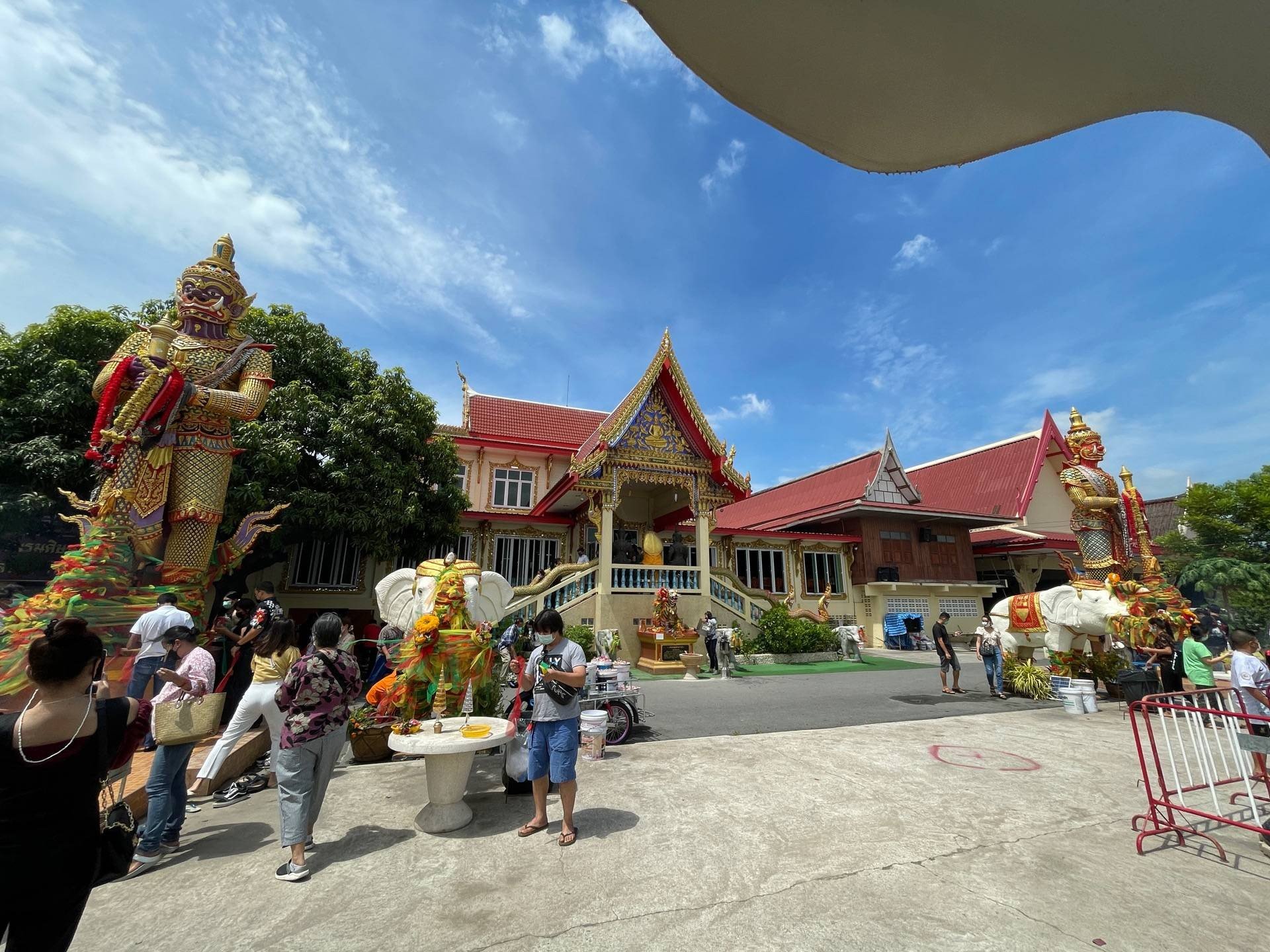 ศาลาการเปรียญ มีจุดคัดกรองก่อนขึ้น บริเวณพระประธานมีสิ่งศักดิ์สิทธิ์มากมายให้สักการะ มีเสียงระนาดดังมา มองไปเป็นพี่ปลาคราฟตลกมากความสามารถมาเป็นจิตอาสาบรรเลงดนตรีขับกล่อม ด้านบนมีวัตถุมงคลให้เช่าบูชาอีกด้วย