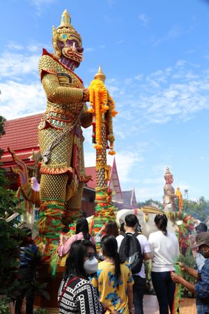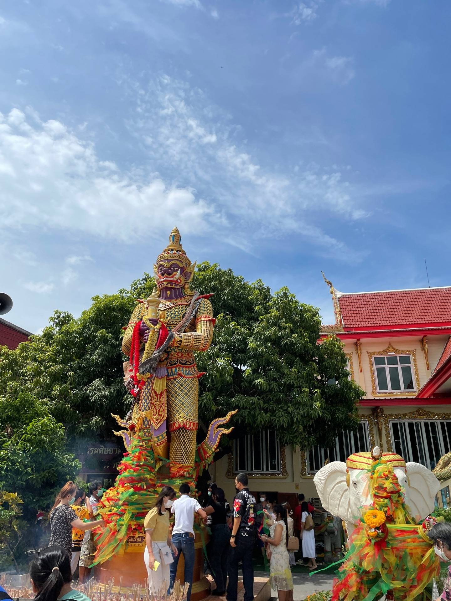 ใกล้กันมีซุ้มเครื่องสักการะชุดละ 60.- มีถาดใส่น้ำแดง กุหลาบ ผ้าสามสี อย่างละ 2 ชุด ใช้ธูป 12 ดอก ไหว้องค์ละ 6 ดอก เริ่มไหว้ขอพรจากองค์สีม่วงจบด้วยองค์สีแดง